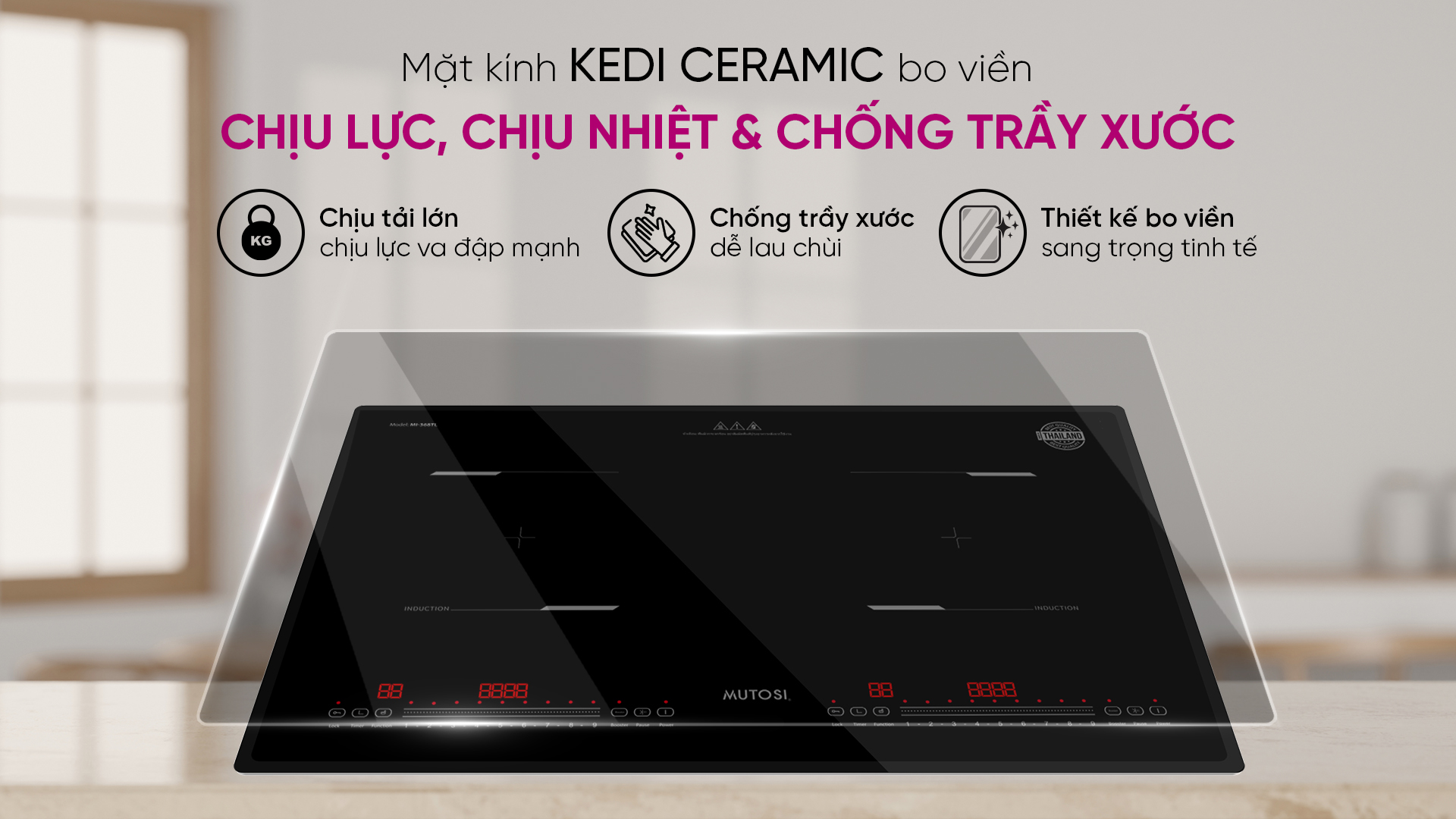 Sở hữu mặt kính KEDI Ceramic cao cấp, bếp từ Mutosi MI-368TL có khả năng chịu tải lớn, chống chịu va đập mạnh và hạn chế trầy xước tối đa trong quá trình sử dụng. Bề mặt kính dễ lau chùi, giúp căn bếp của bạn luôn sạch sẽ, sáng bóng.