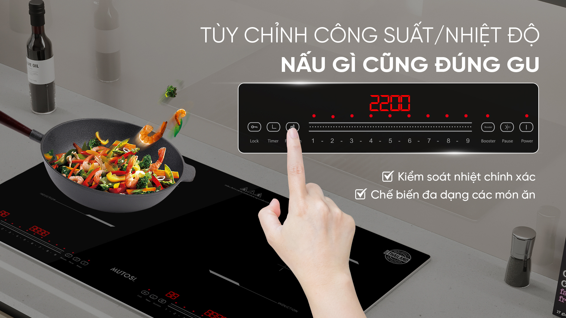 Với hai vùng cảm ứng điều khiển độc lập, bạn có thể dễ dàng tùy chỉnh công suất và nhiệt độ cho từng món ăn. Bảng điều khiển cảm ứng nhạy bén, thao tác mượt mà chỉ với một chạm lướt nhẹ, giúp bạn nấu nhiều món cùng lúc mà vẫn đảm bảo độ chín và hương vị chuẩn xác.