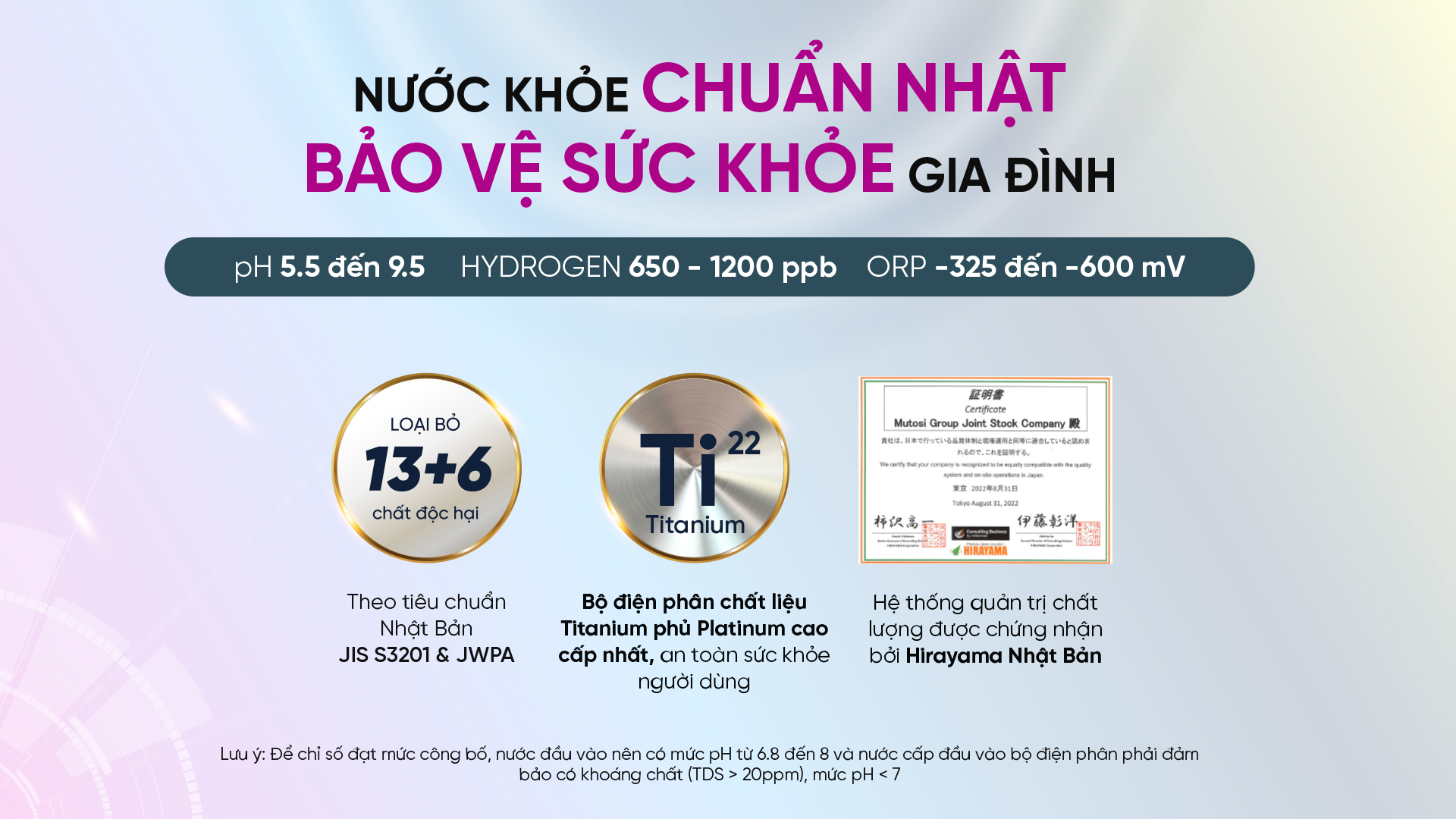 (Lưu ý: Để chỉ số đạt mức công bố, nước đầu vào nên có mức pH từ 6.8 đến 8 và nước cấp đầu vào bộ điện phân phải đảm bảo có khoáng chất (TDS > 20ppm), mức pH < 7)