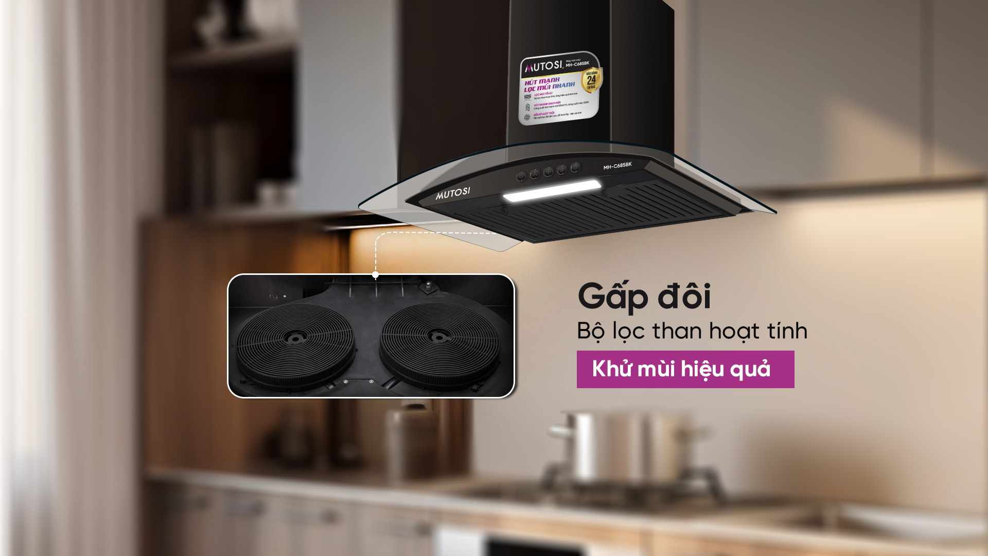 Với 2 tấm lọc Than hoạt tính có khả năng hấp phụ các phân tử mùi khó chịu như mùi thức ăn, mùi khói và hơi dầu mỡ. Nhờ hoạt động dựa trên cơ chế quay vòng tuần hoàn, cụ thể là toàn bộ khói, mùi thức ăn được hút vào trong khoang máy đi qua bộ lọc than rồi trả lại nhà bếp không khí đã được làm sạch. Đồng thời nâng cao hiệu quả bảo vệ động cơ khỏi bụi bẩn, dầu mỡ bắn lên, ngoài ra giúp giảm thiểu sự tích tụ và bám dính vào các bề mặt khác trong không gian bếp.