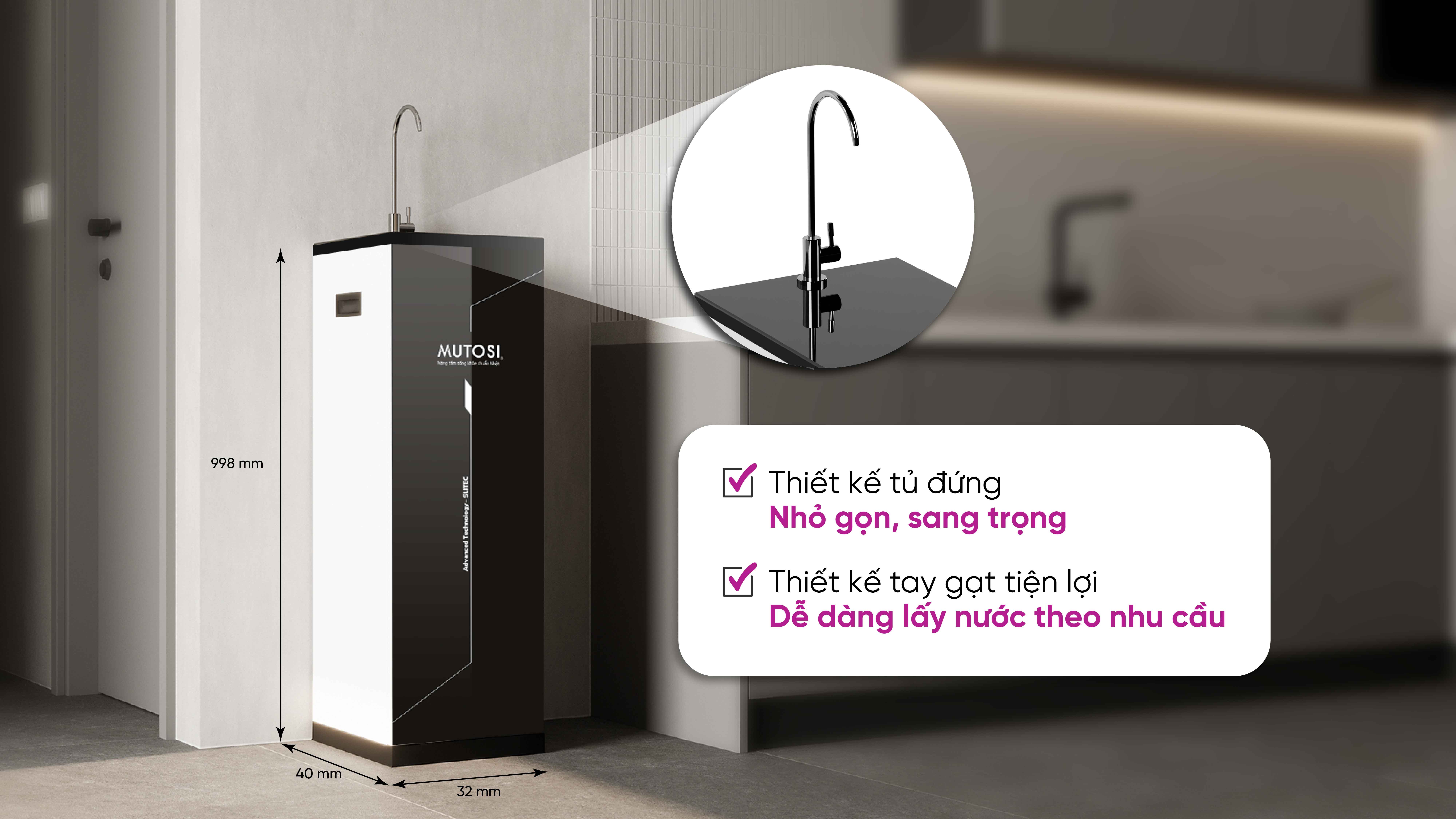Với kích thước chỉ 32 x 40 x 99.8 cm, máy lọc nước MP-S99 nhỏ gọn, phù hợp với nhiều không gian bếp