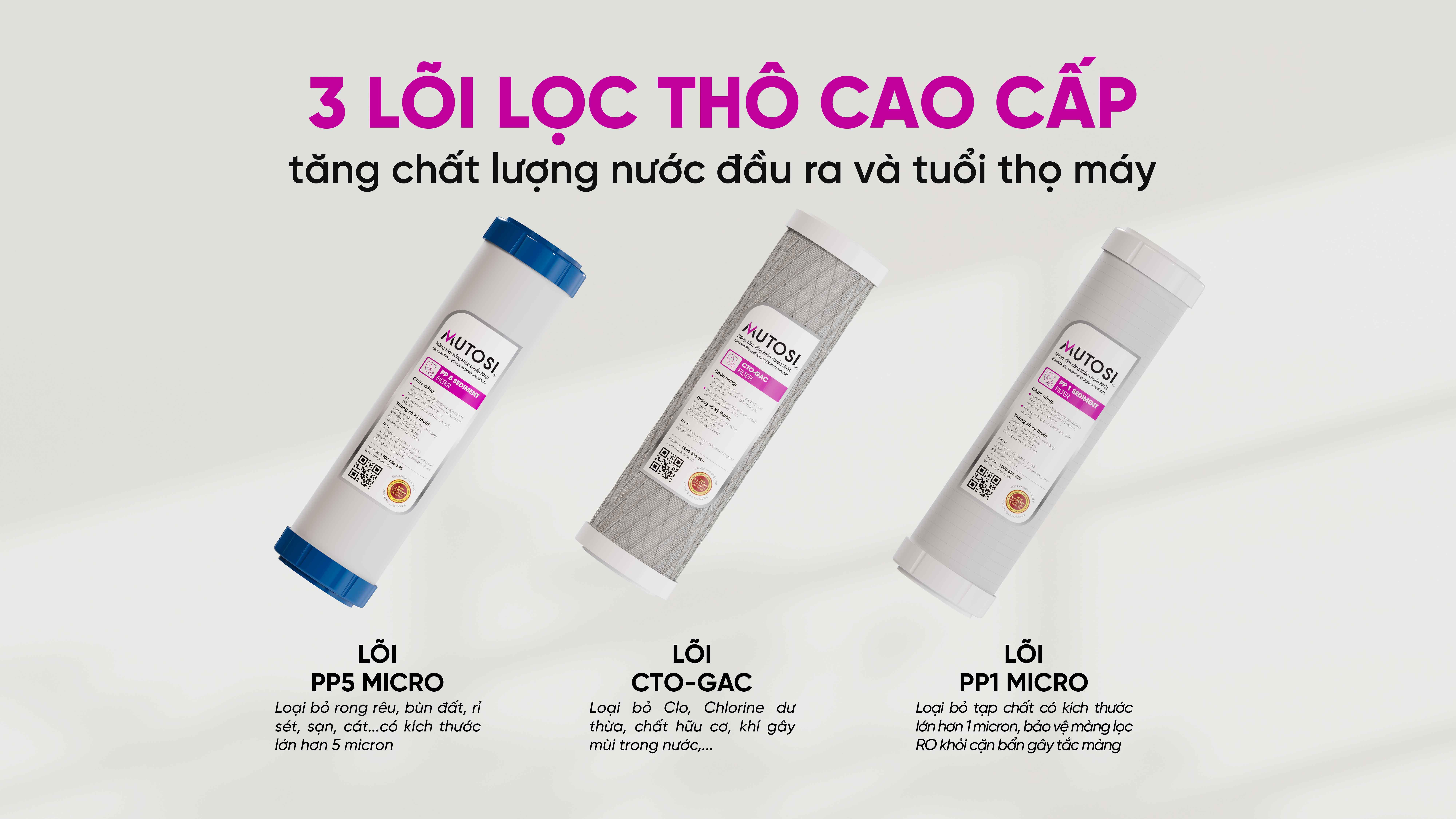 Máy lọc nước MP-S99 được trang bị ba loại lõi lọc thô, góp phần vào quá trình bảo vệ độ bền của hệ thống lọc và tạo ra nguồn nước chuẩn tinh khiết sau lọc.