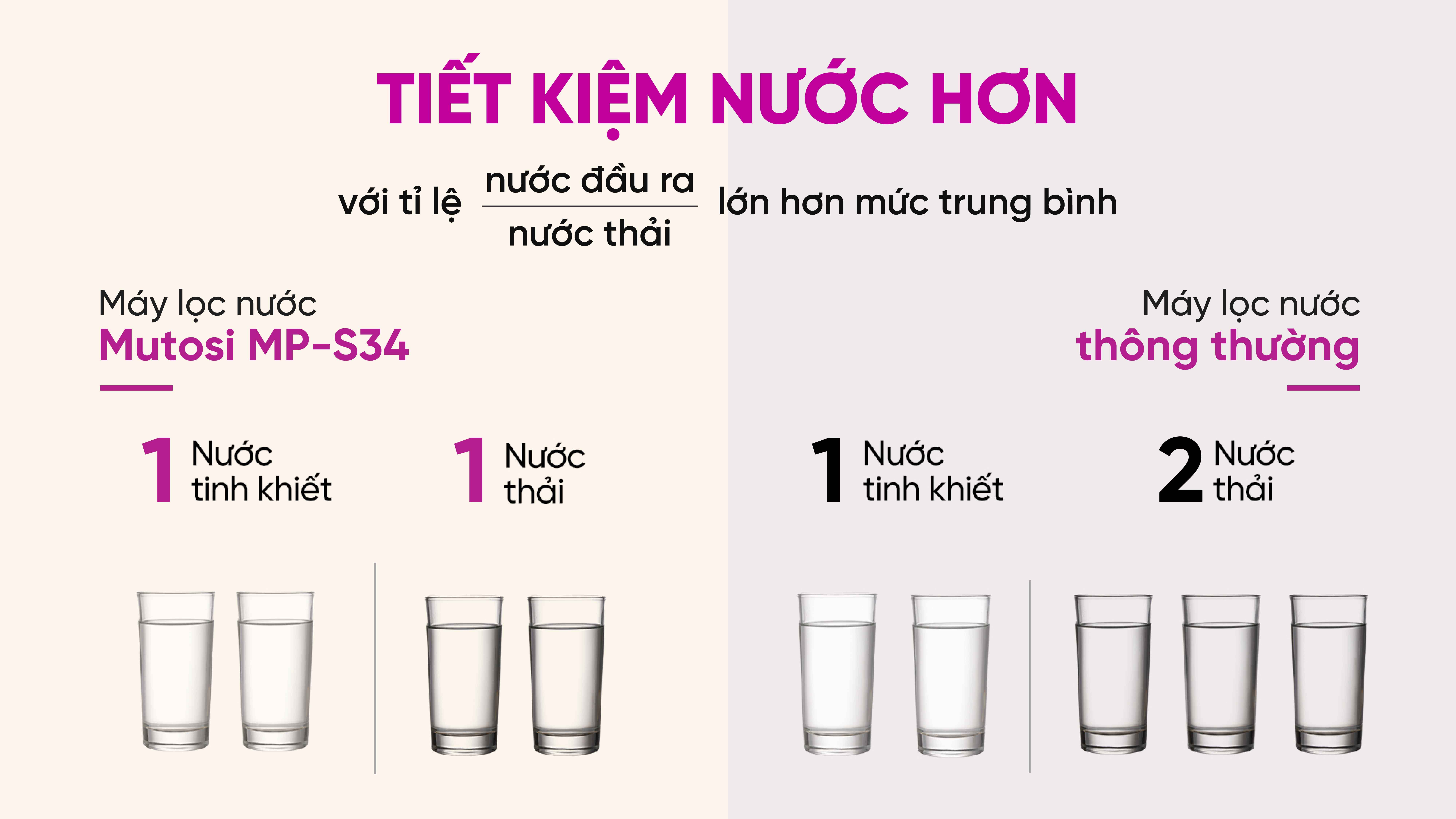 Với tỷ lệ thu hồi nước tinh khiết lên đến 50:50, MP-S99 giúp tiết kiệm nước một cách đáng kể so với các màng lọc thông thường chỉ có tỷ lệ thu hồi 30:70. Như vậy, để có được 2 cốc nước tinh khiết sau lọc, MP-S99 chỉ mất 2 cốc nước thải thay vì 3 cốc nước thải như những dòng máy lọc nước thông thường khác.